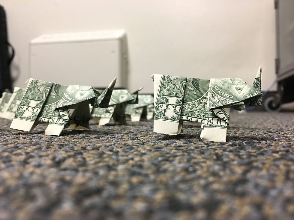 My money project. There are about 80 of these elephants made out of 1 dollar bills. My herd makes me very happy and has delayed my other work, but this is the best thing ever, so clearly I have my priorities straight. What else is more important than any Creative Advertising project though?